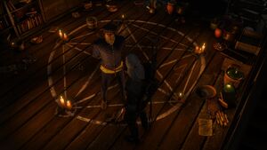 When they reach the University, Shani will convince the guards to allow her in, and she volition assistance Geralt become inside another style before she leaves. Afterwards taking care of some witch hunters, Geralt finds the professor's residence locked up, so he finds another way in through a balcony. However, using Aard appeared to not but weaken the balcony'south door, but also the structural beam of the house. Making his style downstairs, he finds the professor, at present bullheaded, in a protective circle. Later realizing its not his banana, Shakeslock thinks Geralt was sent by O'Dimm, simply relaxes later on Geralt tells him he is a witcher.